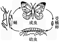果蝇、家蚕的发育过程要经过 ___、 ___ 、 ___ 、 __ __四个阶段,幼虫的 与成虫有明显的差别,这样的发育过程叫做 ___ 。进行这种发育方式的昆虫还有 ____ 、 __ 、金龟子等。