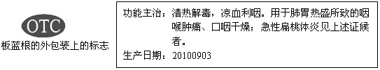 (1)板蓝根外包装上的标志表示板蓝根是_______药。(2)根据说明书中“功能主治”的内容可知,板蓝根可以预防和治疗______。(3)如果保质期是三年,那么有效期应该至______年______月。