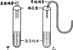 将甲、乙两装置装好后,分别用酒精灯加热至沸腾若干分钟,然后都放在室温25℃的环境中,几天后,甲肉汤变质,乙肉汤仍然新鲜。请问: