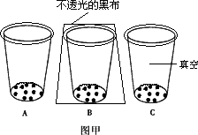 (3)将三个杯子杯口密封好。其中C杯内用注射器抽干气体后再密封,B杯密封后用不透光的黑布全部罩住,A杯不作处理。如图甲所示。