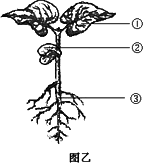 (3)萌发后的大豆种子继续发育形成了幼苗(如图乙)。请写出图乙中①②③各部位分别来自大豆胚的哪些组成部分。