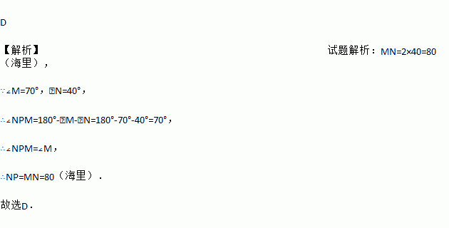 如图,一艘海轮位于灯塔P南偏东70°方向的M处,它以每时40海里的速度向正北方向航行,2时后到达位于灯塔P北偏东40°方向的N处,则N处与灯塔P的距离为( )