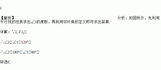 已知l1∥l2,且∠1=120°,则∠2=( )