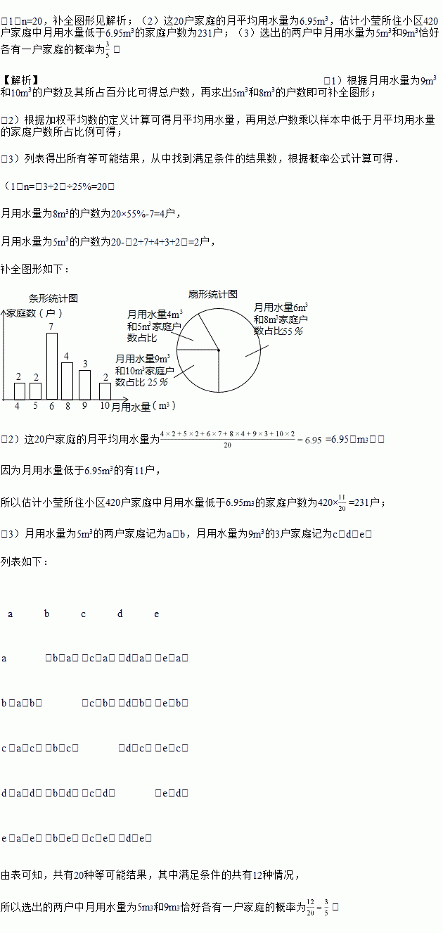 (3)从月用水量为5m3和和9m3的家庭中任选两户进行用水情况问卷调查,求选出的两户中月用水量为5m3和9m3恰好各有一户家庭的概率.