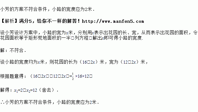 在一块长16m,宽12m的矩形荒地上,要建造一个花园,要求花园面积是荒地面积的一半,如图所示分别是小华与小芳的设计方案.同学们都认为小华的方案是正确的,但对小芳方案是否符合条件有不同意见,你认为小芳的方案符合条件吗?若不符合,请你依照小芳的方案设计小路的宽度.