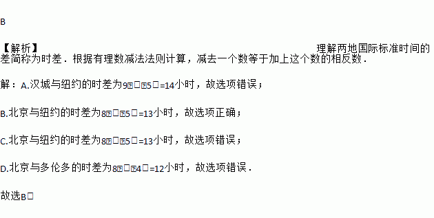 B 【解析】理解两地国际标准时间的差简称为时差.根据有理数减法法则计算,减去一个数等于加上这个数的相反数. 【解析】 A.汉城与纽约的时差为9﹣(﹣5)=14小时,故选项错误; B.北京与纽约的时差为8﹣(﹣5)=13小时,故选项正确; C.北京与纽约的时差为8﹣(﹣5)=13小时,故选项错误; D.北京与多伦多的时差为8﹣(﹣4)=12小时,故选项错误. 故...