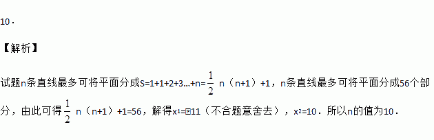 如图所示,1条直线将平面分成2个部分,2条直线最多可将平面分成4个部分,3条直线最多可将平面分成7个部分,4条直线最多可将平面分成11个部分.现有n条直线最多可将平面分成56个部分,则n的值为 .