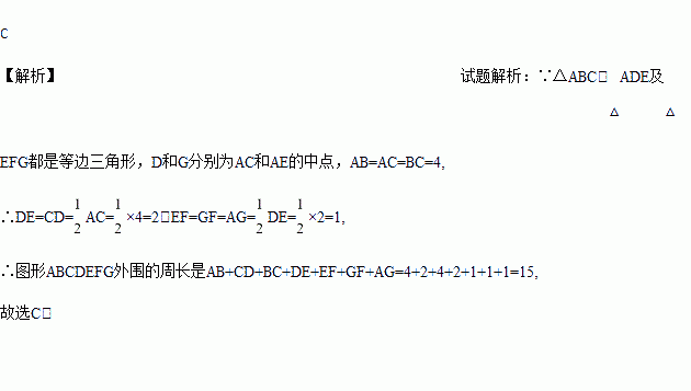 如图,△ABC、△ADE及△EFG都是等边三角形,D和G分别为AC和AE的中点.若AB=4时,则图形ABCDEFG外围的周长(实线部分)是( )