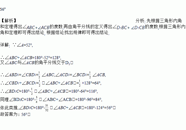 如图,在ΔABC中,∠A=52O,∠ABC 与∠ACB的角平分线交于点D1,∠ABD1与∠ACD1的角平分线交于点D2,依次类推,∠ABD4与∠ACD4的角平分线交于点D5,则∠BD5C的度数是_________.