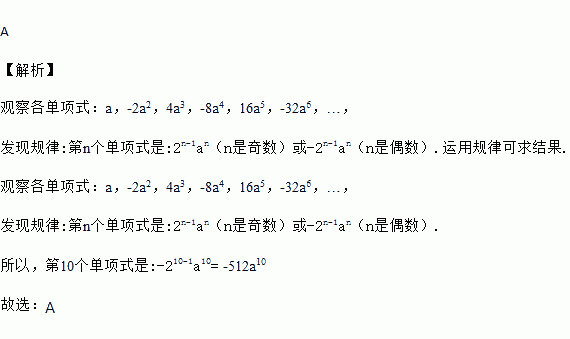 观察下列各单项式:a,-2a2,4a3,-8a4,16a5,-32a6,…,根据你发现的规律,第10个单项式是