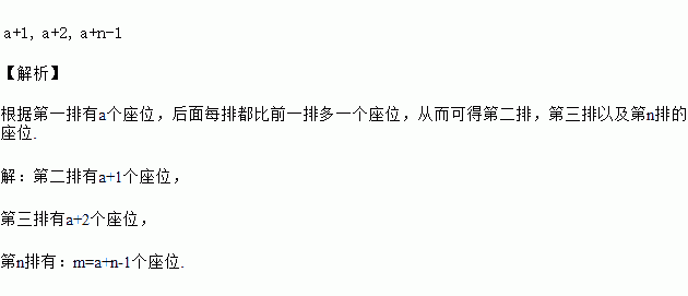 电影院第一排有a个座位,后面每排都比前一排多一个座位,第二排有______个座位,第三排有_____个座位,第n 排有m个座位,则m =_______。(用含a、n的代数式标示)