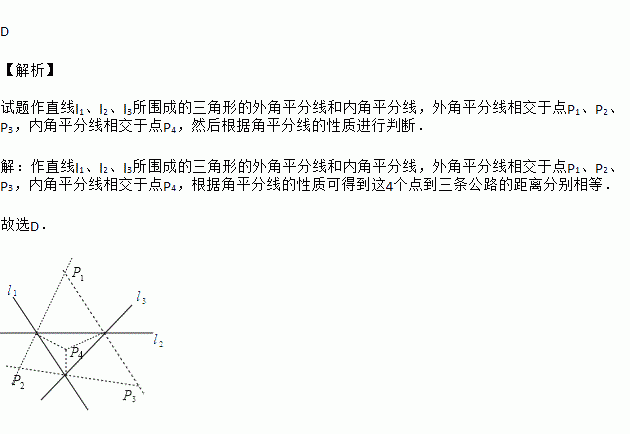 如图,直线l1,l2,l3表示三条相互交叉的公路,现要建一个货物中转站,要求它到三条公路的距离相等,则供选择的地址有( )