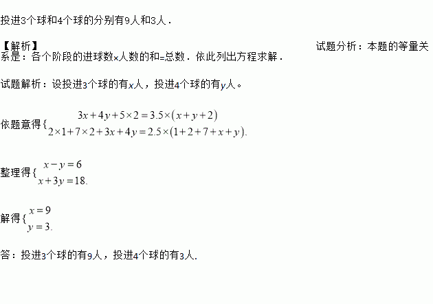 已知进球3个或3个以上的人平均每人投进3.5个球;进球4个或4个以下的人平均每人投进2.5个球,问投进3个球和4个球各多少人?