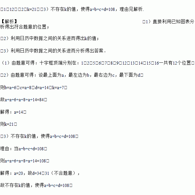 张华发现某月的日历中一个有趣的问题,他用笔在上面画如图所示的十字框,若设任意一个十字框里的五个数为a、b、c、d、k.设中间的一个数为k,如图:试回答下列问题:
