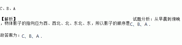 在一天内三个不同时刻,同一棵树的影子如图中A、B、C所示,请将它们按时间的先后顺序排列是_____(上北、下南、左西、右东).