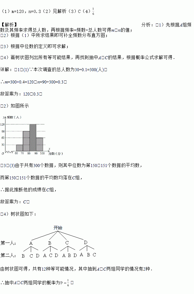 £¨4£©4¸öС×éÿ×éÍÆ¼ö1ÈË£¬È»ºó´Ó4ÈËÖÐËæ»ú³éÈ¡2È˲μӰ佱µäÀñ£¬Ç¡ºÃ³éÖÐA¡¢CÁ½×éѧÉúµÄ¸ÅÂÊÊǶàÉÙ£¿²¢Áбí»ò»Ê÷״ͼ˵Ã÷£®