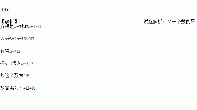 如果一个数的平方根是a+3和2a﹣15,则a的值为_____,这个数为_____.