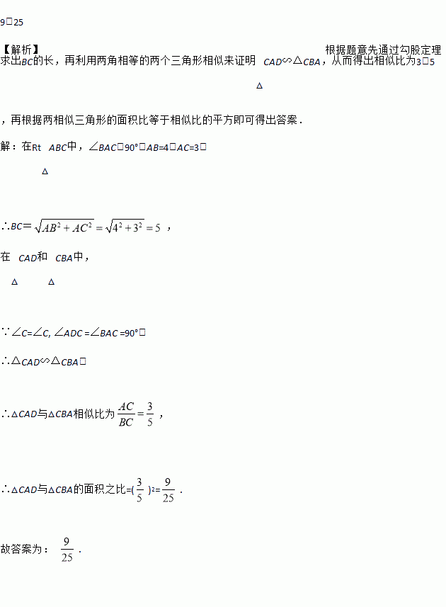 如图,在Rt△ABC中,∠BAC=90°,AB=4,AC=3,AD⊥BC于点D,则△ACD与△ABC的面积比为_________