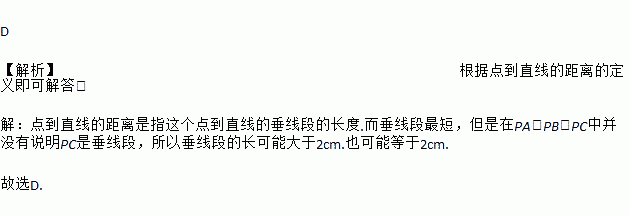D 【解析】根据点到直线的距离的定义即可解答. 【解析】 点到直线的距离是指这个点到直线的垂线段的长度.而垂线段最短,但是在PA,PB,PC中并没有说明PC是垂线段,所以垂线段的长可能大于2cm.也可能等于2cm. 故选D.