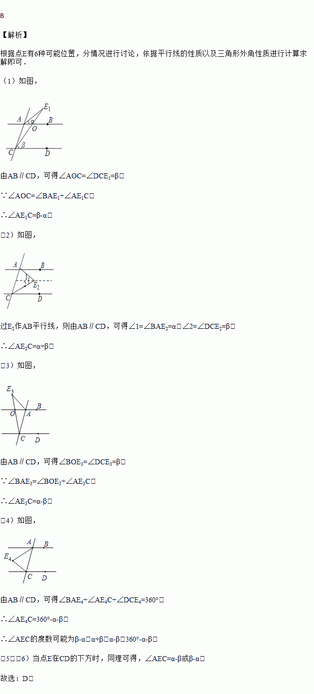 如图,已知直线AB、CD被直线AC所截,AB∥CD,E是平面内任意一点(点E不在直线AB、CD、AC上),设∠BAE=α,∠DCE=β.下列各式:①α+β,②α﹣β,③β﹣α,④360°﹣α﹣β,∠AEC的度数可能是( )