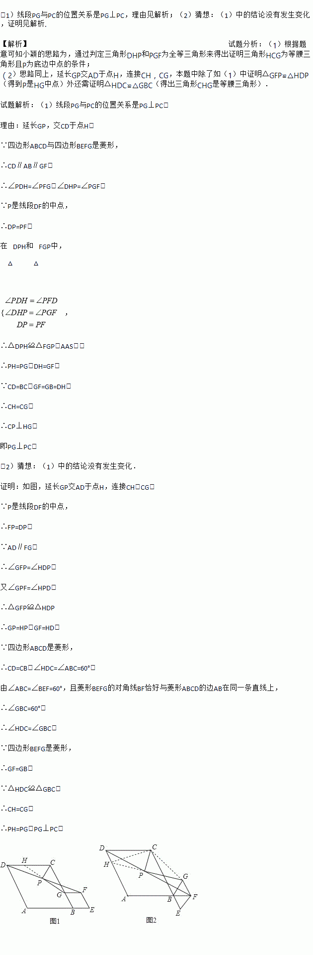 阅读下列材料:问题:如图1,在菱形ABCD和菱形BEFG中,∠ABC=∠BEF=60°,点A,B,E在同一条直线上,P是线段DF的中点,连接PG,PC,探究PG与PC的位置关系