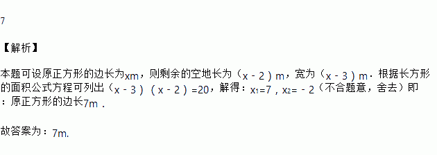 如图,将一块正方形空地划出部分区域进行绿化,原空地一边减少了2m,另一边减少了3m,剩余一块面积为20m2的矩形空地,则原正方形空地的边长为_____m.