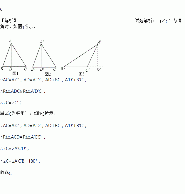 C 【解析】试题解析:当∠C′为锐角时,如图1所示, ∵AC=A′C′,AD=A′D′,AD⊥BC,A′D′⊥B′C′, ∴Rt△ADC≌Rt△A′D′C′, ∴∠C=∠C′; 当∠C为钝角时,如图3所示, ∵AC=A′C′,AD=A′D′,AD⊥BC,A′D′⊥B′C′, ∴Rt△ACD≌Rt△A′C′D′, ∴∠C=∠A′C′D′, ∴∠C+∠A′C′B′=180...