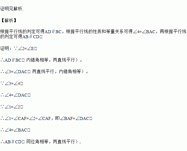 已知:如图,B、C、E三点在同一直线上,A、F、E三点在同一直线上,∠1=∠2=∠E,∠3=∠4.
