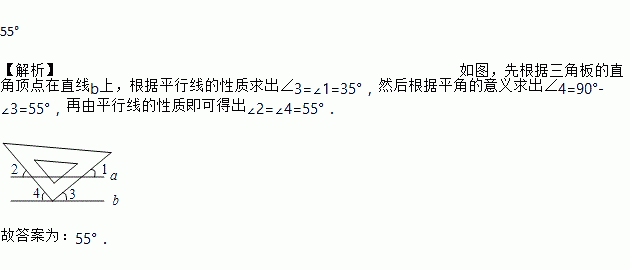 如图,已知a // b,小亮把三角板的直角顶点放在直线b上.若∠1=35°,则∠2的度数为____________.