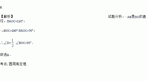 (题文)如图,AB是⊙O的直径,∠AOC=110°,则∠D=( )