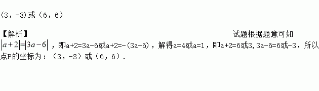 已知点P的坐标是(a+2,3a﹣6),且点P到两坐标轴的距离相等,则点P的坐标是________.