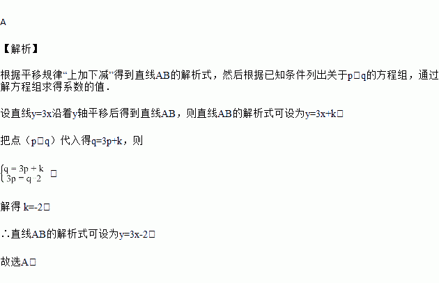 把直线y=3x沿着y轴平移后得到直线AB,直线AB经过点(p,q),且3p=q+2,则直线AB的解析式是( )