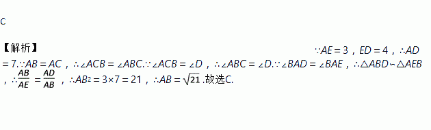 如图,A,B,C,D是⊙O上的四个点,AB=AC,AD交BC于点E,AE=3,ED=4,则AB的长为( )