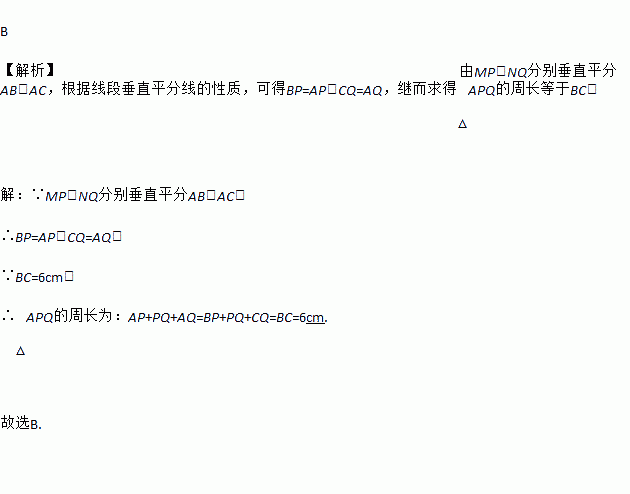 如图,MP,NQ分别垂直平分AB,AC,且BC=6 cm,则△APQ的周长为( )