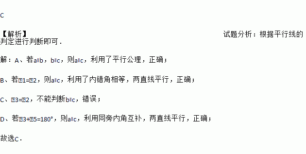 C. 若∠3=∠2,则b∥c D. 若∠3+∠5=180°,则a∥c