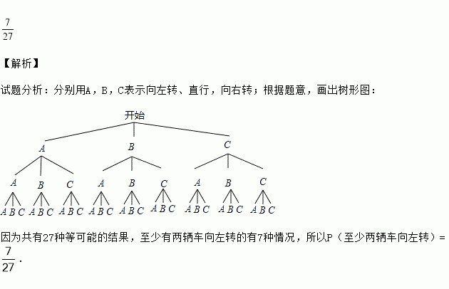 经过某十字路口的汽车,它可能继续直行,也可能向左转或向右转,如果这三种可能性的大小相同,三辆汽车经过这个十字路口,至少有两辆车向左转的概率为 。