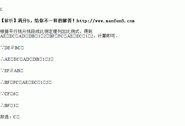 如图,已知在△ABC中,点D,E,F分别是边AB,AC,BC上的点,DE∥BC,EF∥AB,且AD:DB=1:2,CF=6,那么BF等于( )
