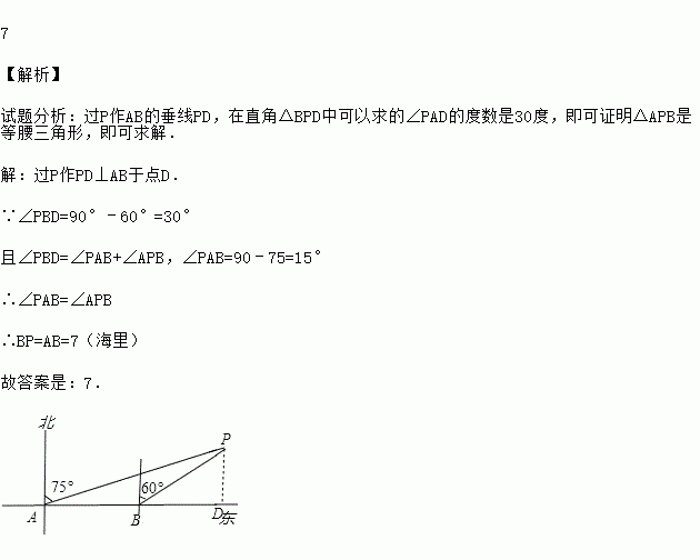某轮船由西向东航行,在A处测得小岛P的方位是北偏东75°,又继续航行7海里后,在B处测得小岛P的方位是北偏东60°,则此时轮船与小岛P的距离BP= 海里.