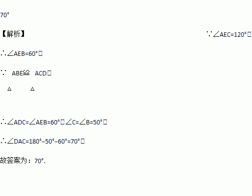 已知:△ABE≌△ACD,AB=AC,BE=CD, ∠B=50°, ∠AEC=120°,则∠DAC的度数为__________.