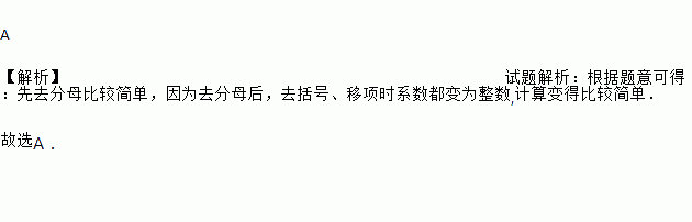 A 【解析】试题解析:根据题意可得:先去分母比较简单,因为去分母后,去括号、移项时系数都变为整数,计算变得比较简单. 故选A.