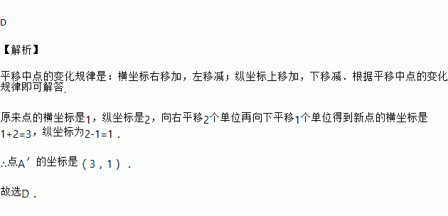 点A(1,2)先向右平移2个单位长度,再向下平移1个单位长度得到点A′,则点A′的坐标是( )