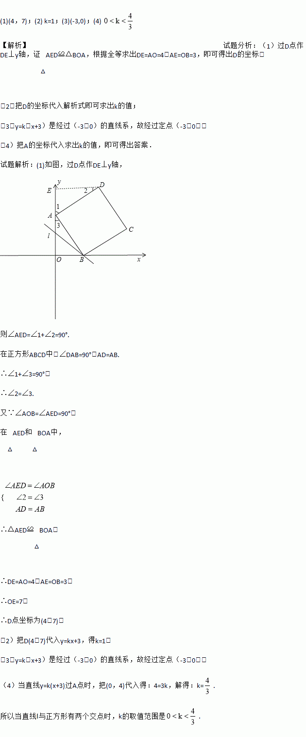 在平面直角坐标系xOy中,点A(0,4),B(3,0),以AB为边在第一象限内作正方形ABCD,直线l:y=k(x+3).