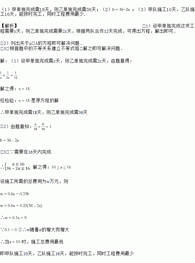 为顺利通过“文明城市”验收,盐城市政府拟对部分地区进行改造,根据市政建设需要,须在16天之内完成工程.现有甲、乙两个工程队,经调查知道:乙队单独完成此工程的时间是甲队单独完成此工程时间的2倍,若甲、乙两队合作只需12天完成.