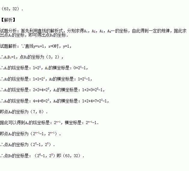 正方形A1B1C1O,A2B2C2C1,A3B3C3C2,…按如图的方式放置.点A1,A2,A3,…和点C1,C2,C3,…分别在直线y=x+1和x轴上,则点B6的坐标是 .