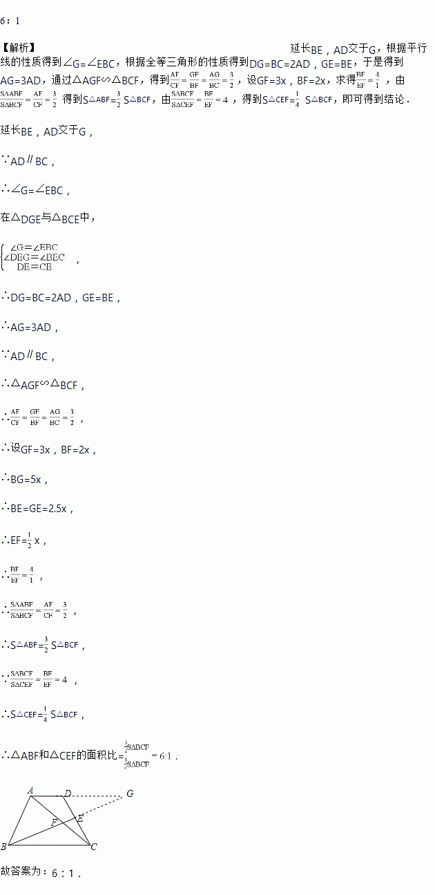 如图,在梯形ABCD中,AD∥BC,BC=2AD,点E是CD的中点,AC与BE交于点F,那么△ABF和△CEF的面积比是______ .