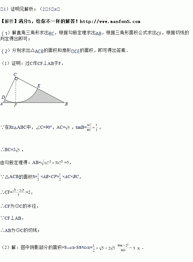 如图,Rt△ABC中,∠C=90°,AC=,tanB=,半径为2的⊙C,分别交AC,BC于点D,E,得到.