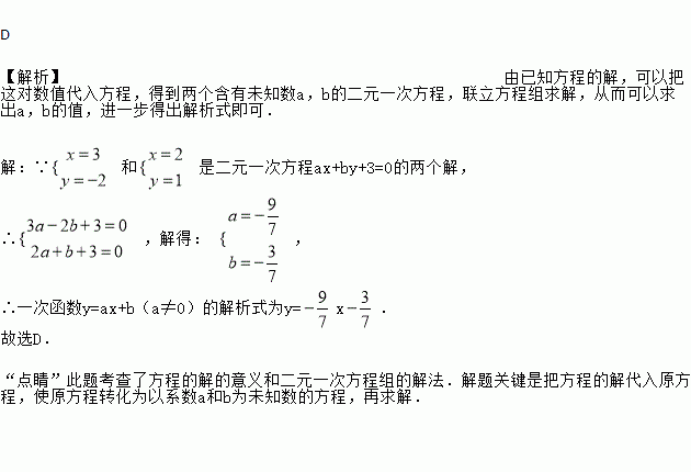 已知 和是二元一次方程ax+by+3=0的两个解,则一次函数y=ax+b(a≠0)的解析式为