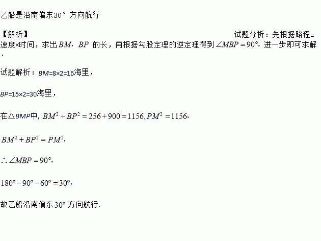 在B港有甲乙两艘渔船,若甲船沿北偏东60°方向以8海里/时的速度前进,乙船沿南偏东某个角度以15海里/时的速度前进,2小时后,甲船到M岛,乙船到P岛,两岛相距34海里,你知道乙船是沿哪个方向航行的吗?
