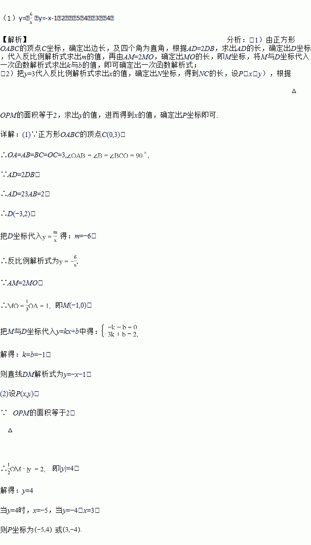 如图,在平面直角坐标系中,正方形OABC的顶点O与坐标原点重合,点C的坐标为(0,3),点A在x轴的负半轴上,点D、M分别在边AB、OA上,且AD=2DB,AM=2MO,一次函数y=kx+b的图象过点D和M,反比例函数y=