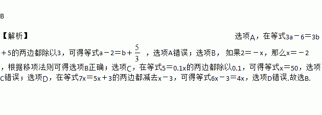 B 【解析】选项A,在等式3a-6=3b+5的两边都除以3,可得等式a-2=b+ ,选项A错误;选项B, 如果2=-x,那么x=-2,根据移项法则可得选项B正确;选项C,在等式5=0.1x的两边都除以0.1,可得等式x=50,选项C错误;选项D,在等式7x=5x+3的两边都减去x-3,可得等式6x-3=4x,选项D错误.故选B.